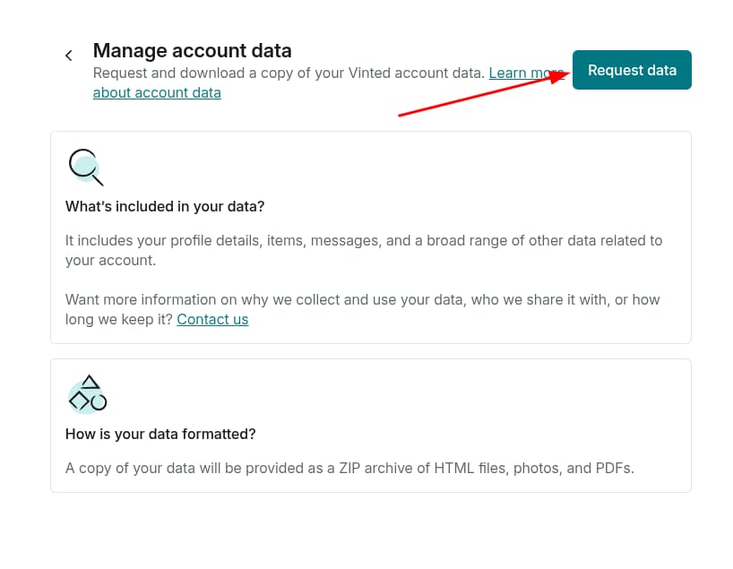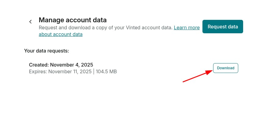 Go to your Vinted account settings then click on “Privacy Settings” > “Manage account Data” > “Request data”