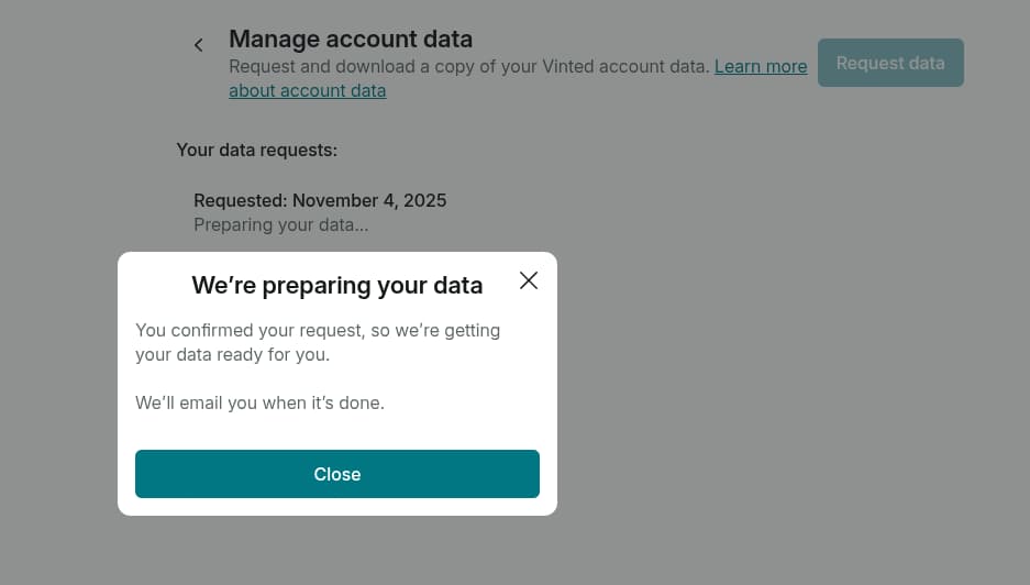 Depending on the amount of data you have on Vinted, it can take from a few minutes to a few hours before your data is ready to download. Once ready, you will receive another email. You will then be able to download a ZIP file containing all your Vinted data including the reports made against your account.